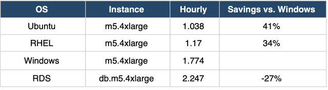 AWS provides Windows, Ubuntu, and RedHat Enterprise Linux (RHEL) AMIs with SQL Server Web pre-installed. At the time of this writing, the following were hourly, on-demand rates for an EC2 m5.4xlarge server: