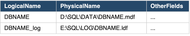 MOVE ‘DBNAME_log’ to ‘/data/DBNAME.ldf’,